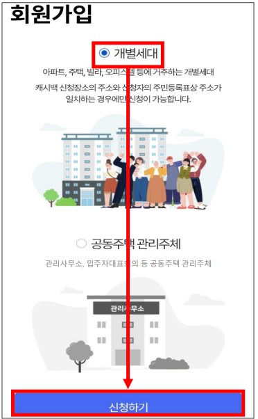 ✔ '개별세대' 유형을 선택하고 '신청하기' 클릭합니다.