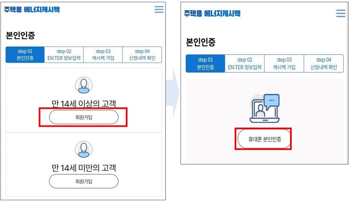 ✔ 만 14세 이상의 고객 회원 가입 클릭하고 휴대폰 본인인증을 순서에 따라 진행합니다.