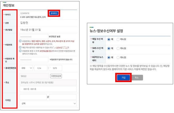 ✔ 개인정보에 아이디, 성명, 생년월일, 비밀번호, 휴대전화 번호, 주소 등을 입력합니다.