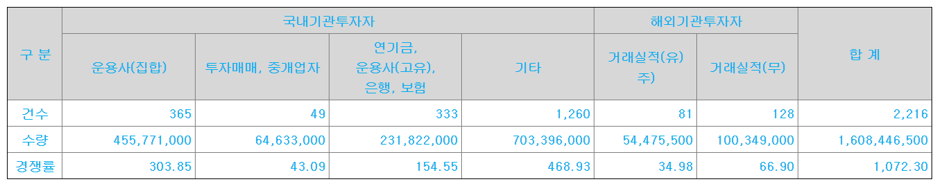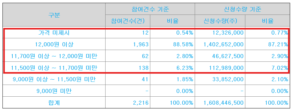 참여 기관의 98.15% 가 희망밴드 상단 9천원이 넘는 11,500원 이상의 가격을 제시한 것으로 알려졌습니다.