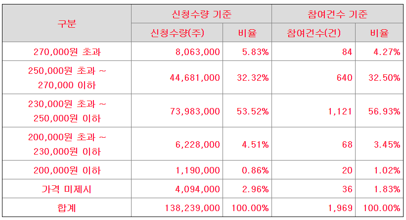 에이피알의 희망가액은 147000원 ~ 200,00원이었는데요. 수요예측에 참여한 기관의 98%가 희망밴드 상단인 20만원을 초과한 금액으로 제시하였습니다.