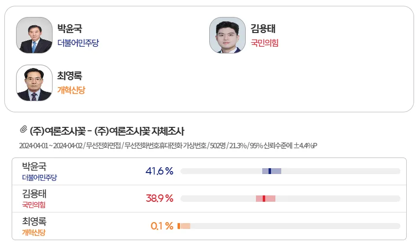 4월 2일 여론조사 결과는 조사 기관에 따라 차이가 생겼습니다. 여론조사꽃의 조사 결과는 박윤국 후보 41.6%, 김용태 후보 38.9% 나왔고요. 리얼미터와 포천뉴스 조사 결과는 박윤국 45%, 김용태 46.1%로 김용태후보가 1% 앞선것으로 나왔어요.