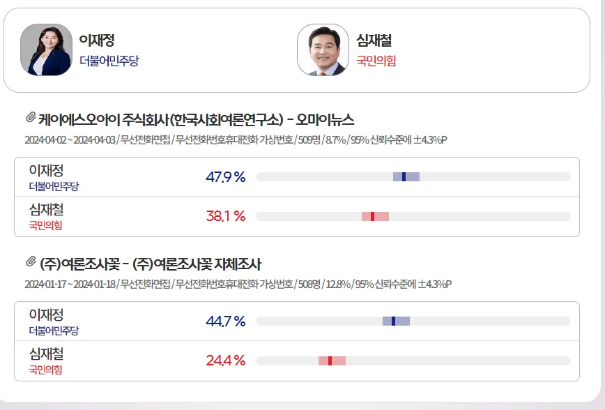 여론조사결과는 여론조사 꽃과 '여론M'이라는 사이트를 바탕으로 정리했습니다. 내 지역의 여론조사 결과 및 22대 국회의원 선거 전국의 여론조사 결과를 상세히 보시려면 아래 바로가기를 이용해주세요.