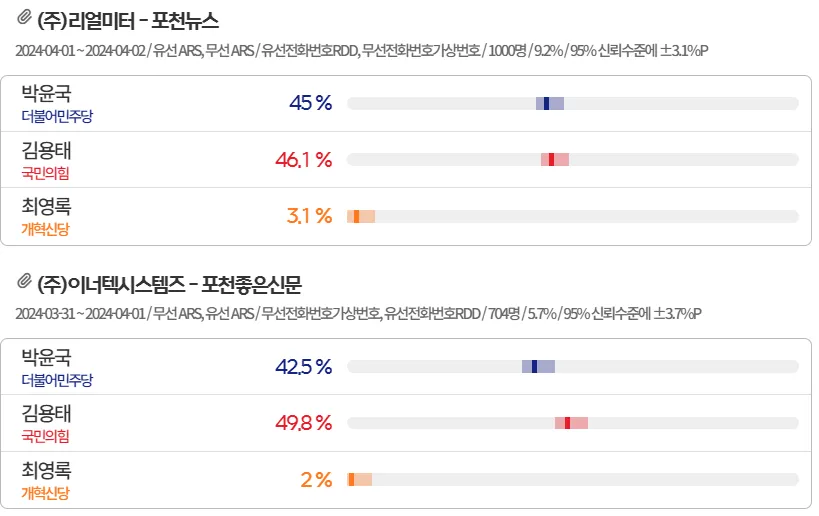그리고 이너텍시스템즈와 포천좋은신문에서 발표한 4월 1일자 결과에선 민주당 박윤국 42.5%, 국힘당 김용태 후보 49.8%로, 오차 범위 내에서 김용태 후보가 앞선 것으로 나왔습니다.
