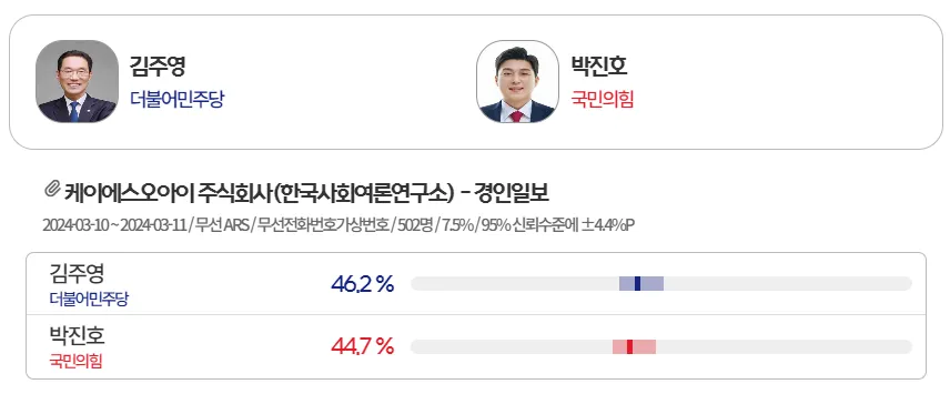 가장 최근의 여론조사 결과는 3월 11일에 나온 것인데요. 김주영 후보 46.2%, 박진호 후보 44.7%로 간격이 좁아지며 오차범위 안에서 경합을 벌이고 있습니다.