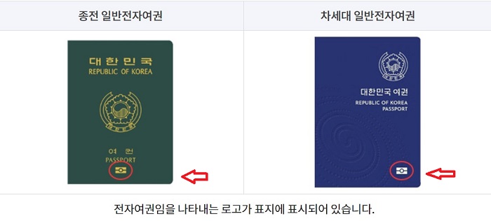 아래 사진에서 빨간 화살표 왼쪽에 표시된 부분이 있다면 전자여권이 맞습니다.