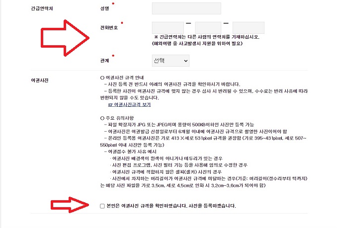 개인 정보 입력 부분에서 해당 내용을 모두 입력합니다. '본인은 여권사진 규격을 확인하였습니다. 사진을 등록하겠습니다.'까지 체크합니다.