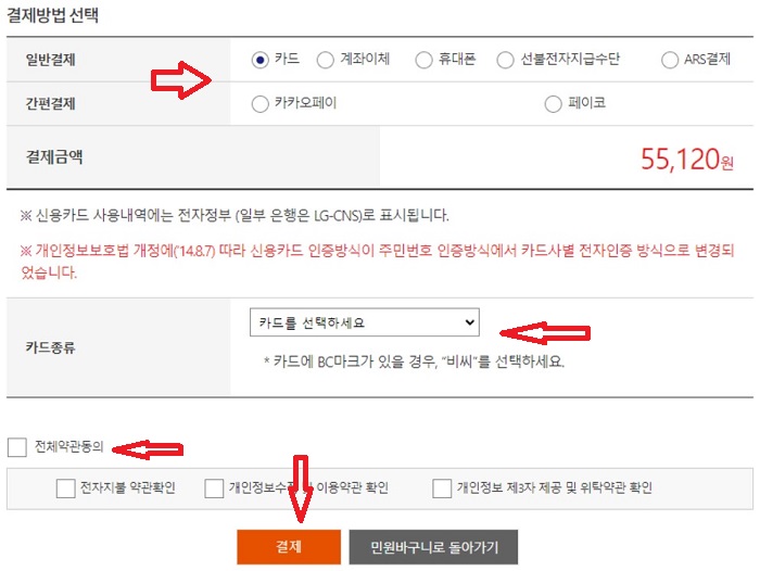 결제 방법을 선택하고 전체약관 동의에 체크한 후에 결제 버튼을 누릅니다.