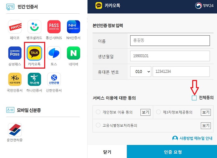 회원 신청하기를 누르고 '간편 인증'을 선택합니다. 저는 카카오톡으로 인증요청을 했습니다. 휴대폰 카톡 메시지를 확인하여 인증하기를 누르고 인증완료를 눌러줍니다.