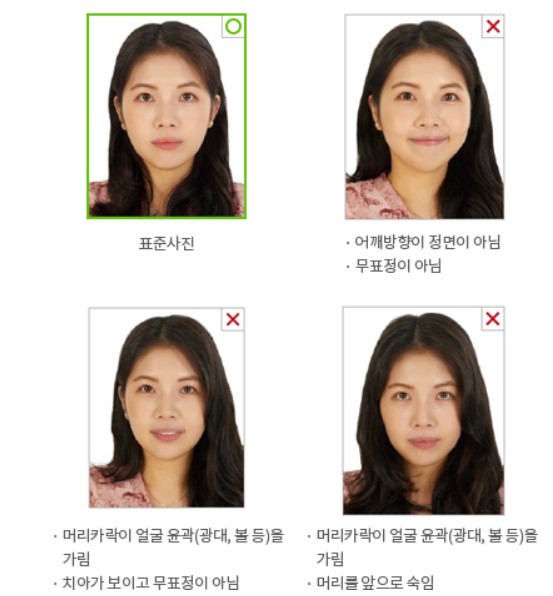 - 치아가 보이지 않아야 하고 무표정이어야 합니다. (웃는 표정 불가)