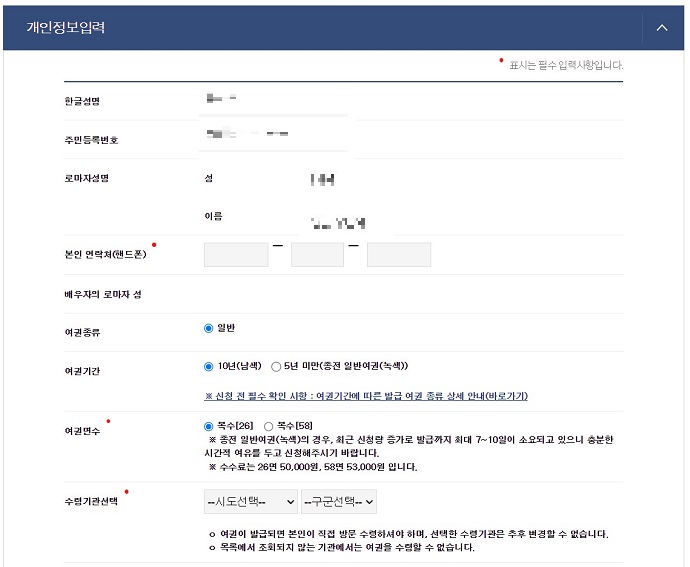 여권 발급 수수료는 성인의 경우 10년 유효기간의 여권은 26면은 50,000원이며 58면은 53000원입니다.