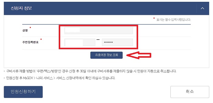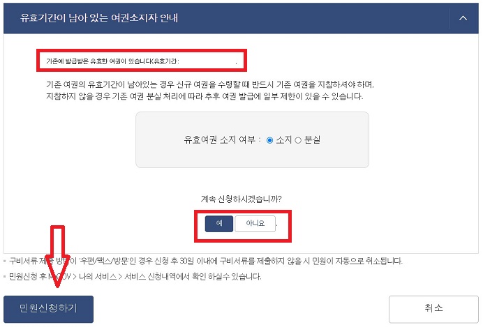 신청자 정보 화면에 성명, 주민등록번호를 입력하고 '유효여권 정보 조회'를 누릅니다. '기존에 발급받은 유효한 여권이 있습니다(0000년 0월 00일까지)'라고 조회가 됩니다.