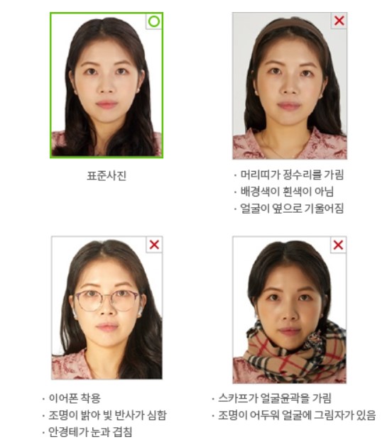 - 머리카락으로 눈을 가려서는 안 되며 얼굴 전체(이마~턱, 얼굴 윤곽, 귀 등)가 완전히 노출되어야 합니다.