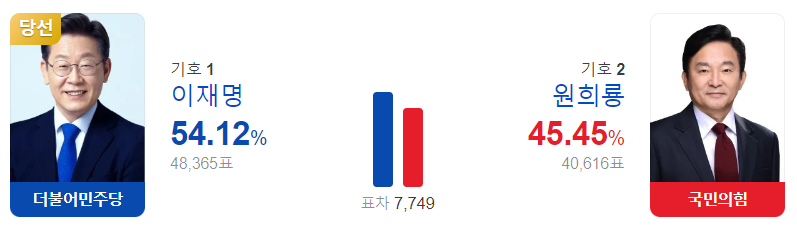 인천 계양을 지역은 여론조사나 출구조사에서 모두 이재명 후보가 1위로 나왔는데요. 투표 결과도 마찬가지로 54.12%의 득표율을 차지하며 국회의원으로 당선되었습니다.