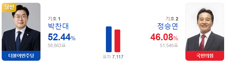 연수갑 투표 결과, 더불어민주당 박찬대 후보가 득표율 52.44%를 얻어 국회의원으로 당선되었습니다.
