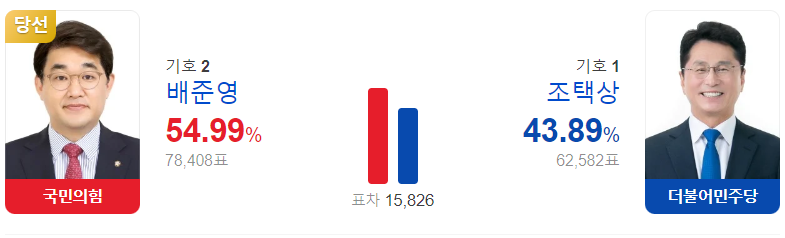 개표 결과, 국민의힘 배준영 후보가 득표율 54.99%를 얻어 국회의원으로 당선되었습니다.