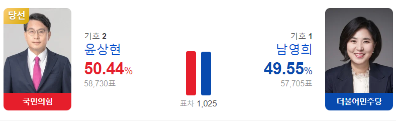 22대 총선에서 인천 동구미추홀구을 지역은 여론조사 결과가가 1% 차이도 안나는 초박빙 지역이었어요. 출구조사에서는 더불어민주당 남영희 후보가 53.2%로 나타나 국민의힘 윤상현 후보를 앞질렀는데요.