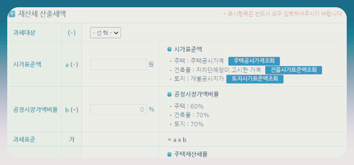 과세표준은 공시가격에 공정시장가액비율을 곱한 값입니다. 공시가격은 정부에서 발표하는 가격이며, 주택의 경우 국토교통부 사이트에서 확인할 수 있습니다.