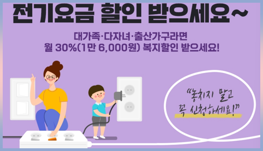 - 다자녀 가구 및 대가족: 월 전기요금의 30% 감면(월 최대 16,000원 한도)