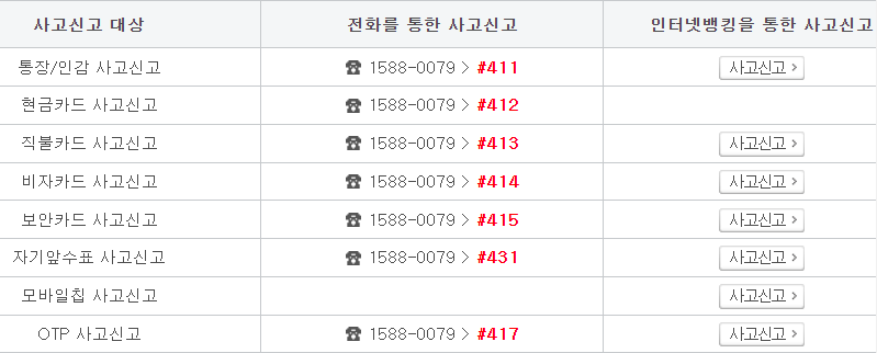 통장/인감 사고신고는 1588-0079 연결후 #411을 누르세요. 현금카드 사고신고는 1588-0079 연결후 #412를 누르면 됩니다.