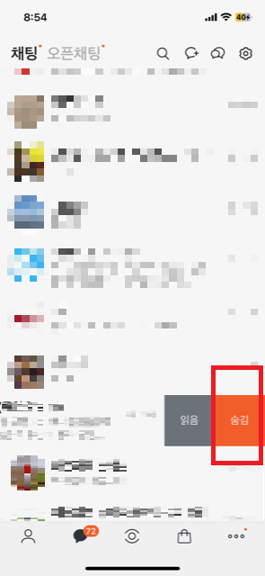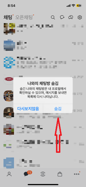 숨김을 누르면 "나와의 채팅방 숨김"이라는 메시지 창이 뜹니다.