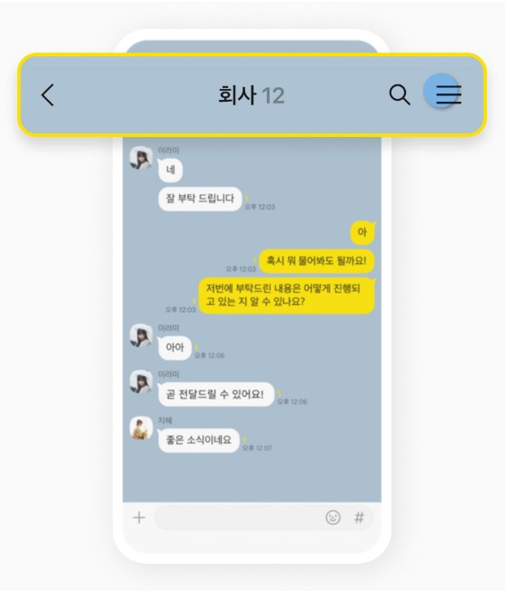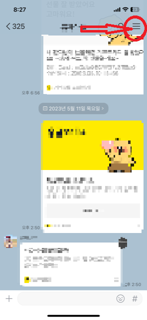 ① 채팅방에서 상단의 오른쪽 세 줄 표시를 누릅니다. (빨간 동그라미 부분)