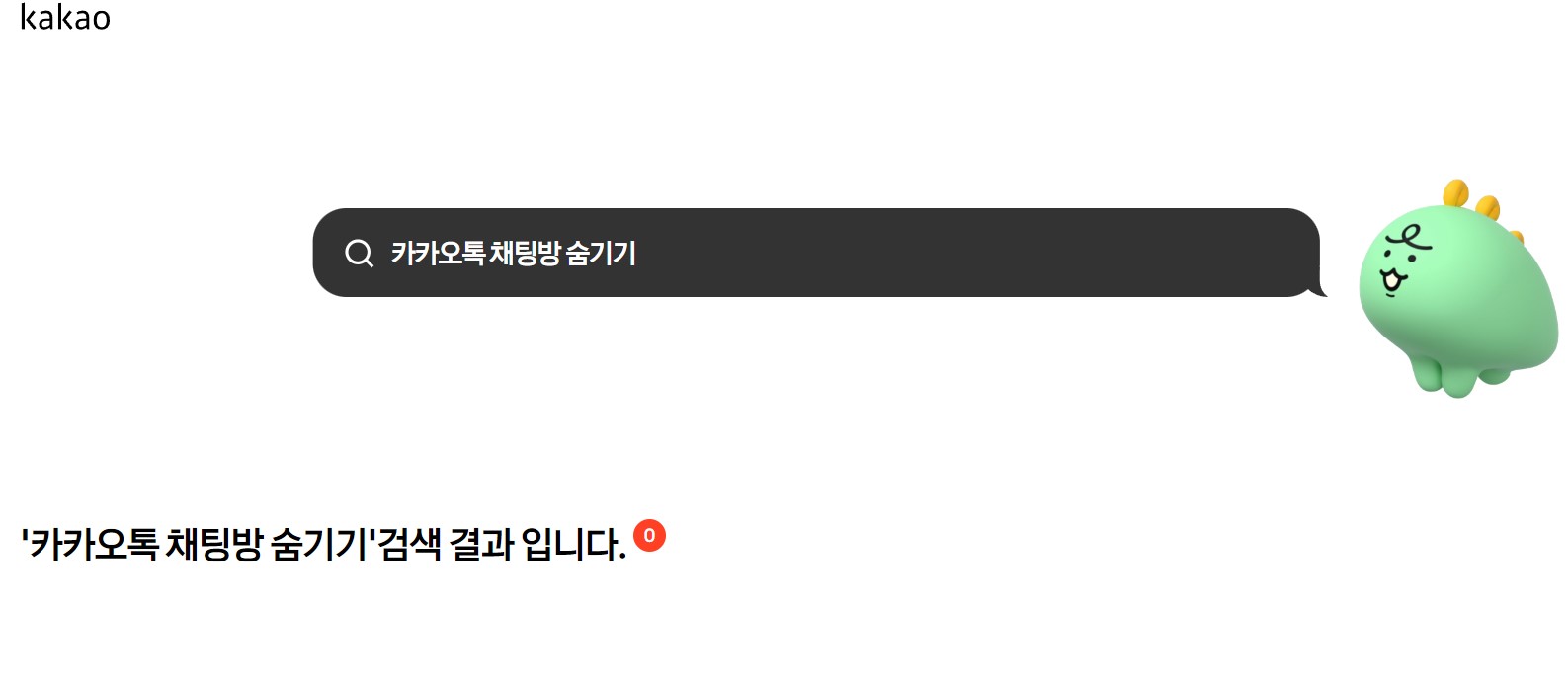 위 이미지처럼 카카오톡 홈페이지에서 "카카오톡 채팅방 숨기기" 질문을 입력하여 보았지만 검색 결과는 0으로 나왔습니다.
