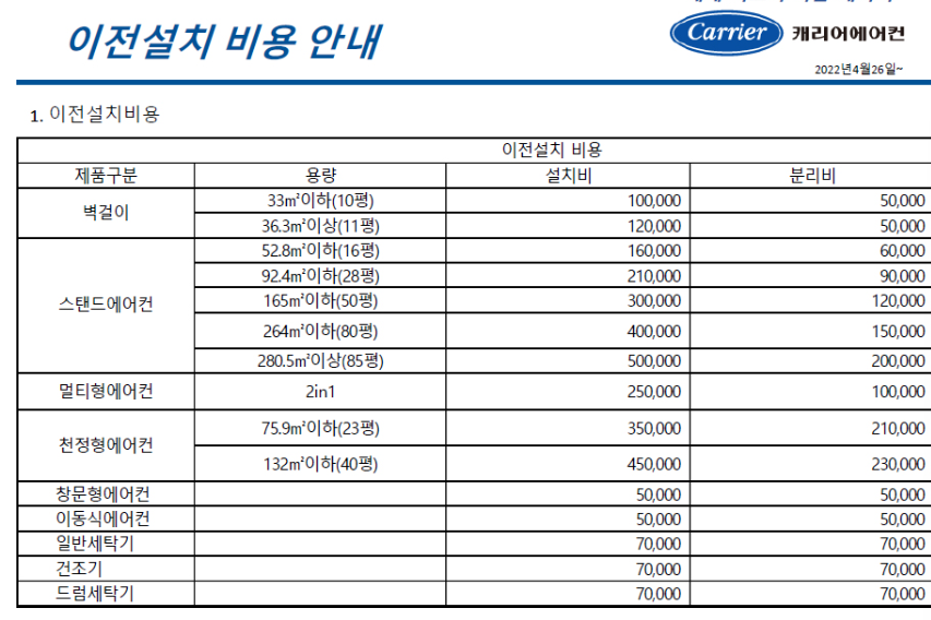 캐리어 에어컨 이전 설치 비용과 추가 비용도 홈페이지에서 확인할 수 있습니다. 벽걸이, 스탠드형, 천정형, 창문형 등 에어컨 종류별로 금액이 다르니 아래 바로가기 버튼을 눌러 확인해 보시기 바랍니다.