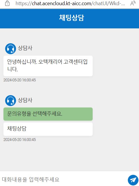 위 버튼을 누르면 아래와 같은 채팅창이 열립니다. 궁금한 사항을 대화창에 입력하여 상담하면 됩니다.