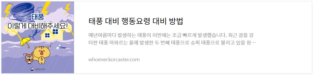 우리나라는 매년 여름마다 태풍이 여러개가 발생하여 큰 피해를 주고 있습니다. 태풍이 동반하는 집중호우로 인해 더욱 큰 피해를 보는 경우가 많습니다. 그래서 태풍이 올 때 미리 대비해야 피해가 최소화될 수 있습니다.