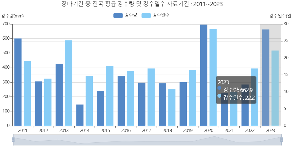 2023년 장마기간 동안의 강수량은 662.9ml였고 강수일수는 22.2일이었습니다.