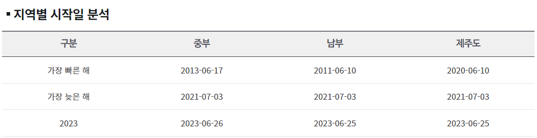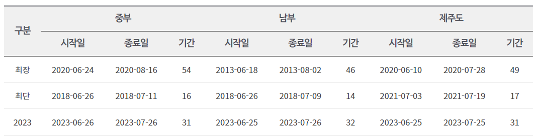 제주도와 남부지방은 2023년 6월 25일부터 시작되었는데요. 제주도는 7월 25일, 남부지방은 7월 26일 종료되었습니다.