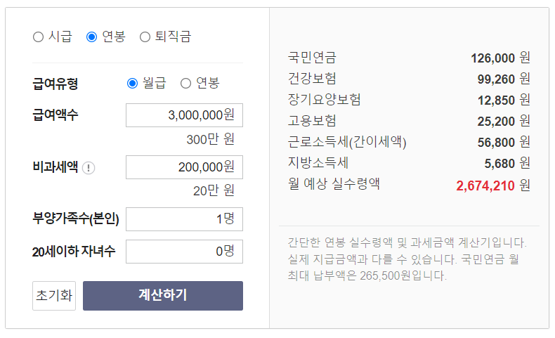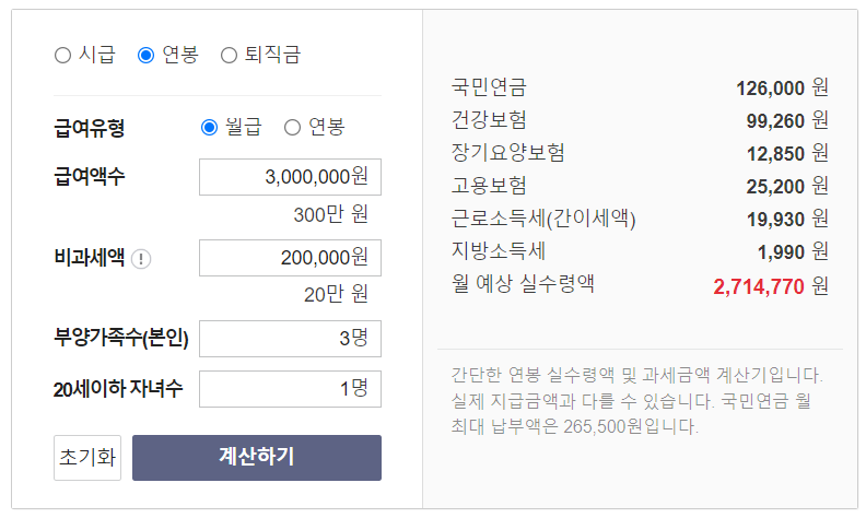 아래 화면처럼 급여계산기가 나오는데요. 내 월급 금액을 입력하고 가정하고 비과세액(식대 등)을 입력하고 부양가족수, 자녀수를 입력하고 계산하기만 눌러주면 결과가 나옵니다.