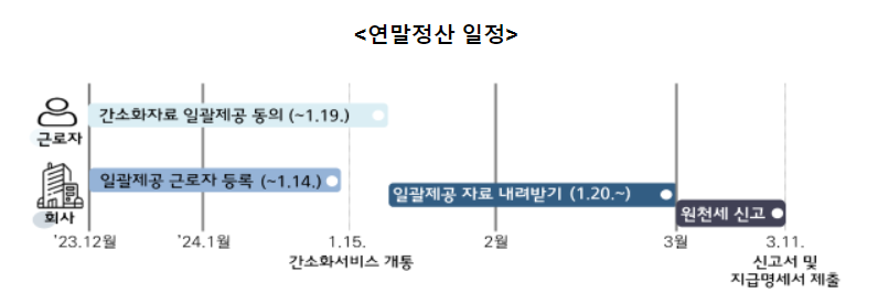 회사에서는 2023년 중 근로소득이 발생한 모든 근로자(퇴사자 포함, 일용근로자 제외)를 대상으로 2024년 2월분 급여 지급 시기까지 연말정산을 완료합니다. 그리고 2024년 3월 11일까지 원천세 신고서와 지급명세서를 제출해야 합니다.