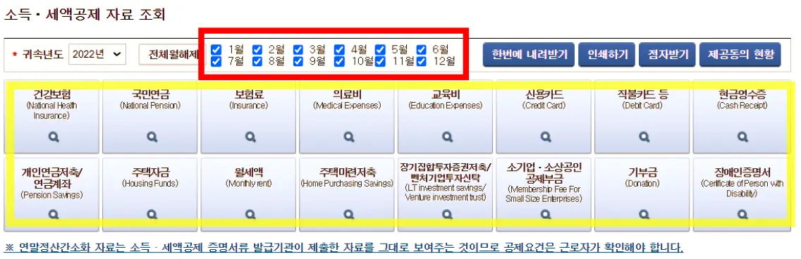 ✔ 공제 항목의 내용을 확인한 후 공제 요건에 맞는 자료를 '한번에 내려받기'하거나 인쇄합니다.