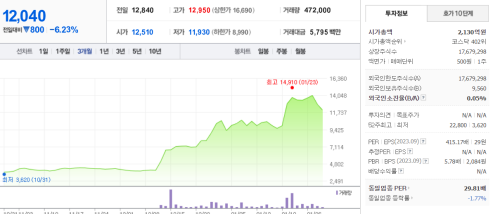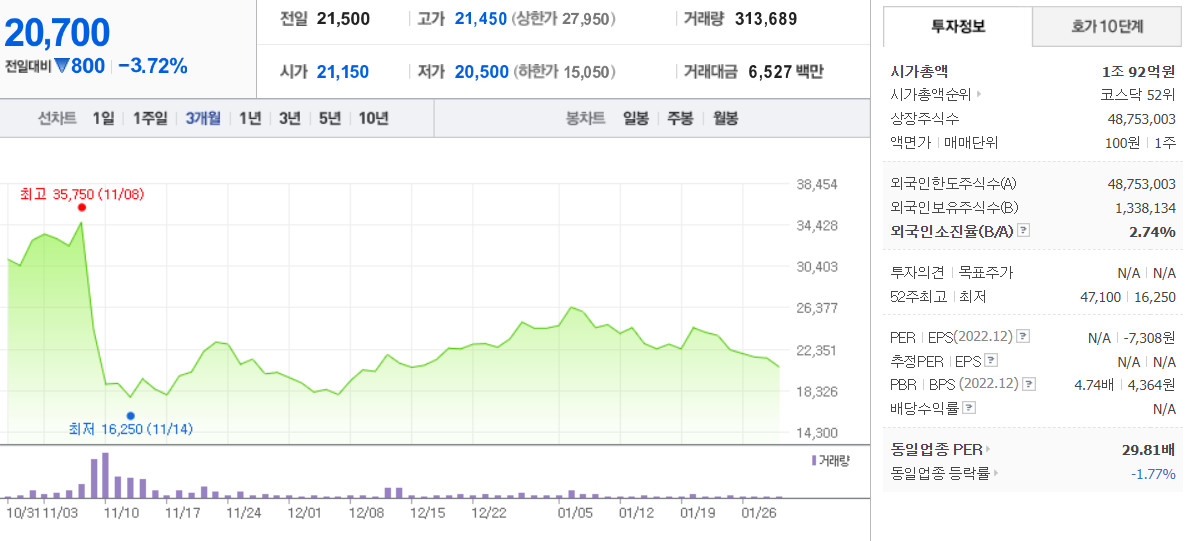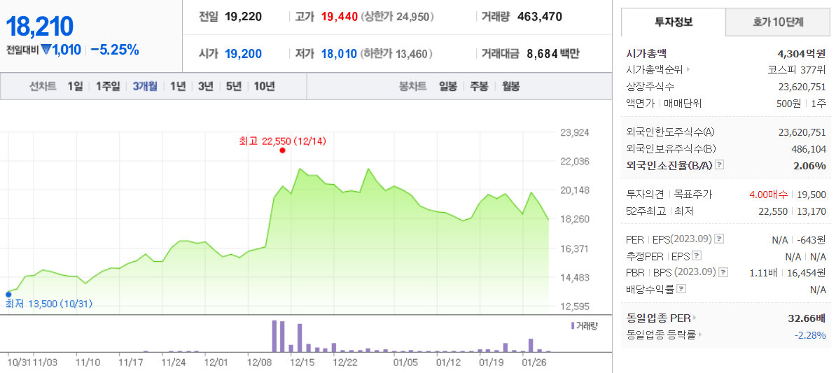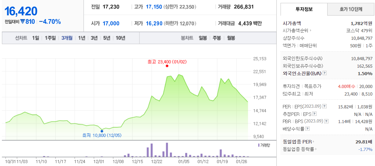 최근 실적을 살펴보면 2023년 6월 기준 매출액 17.2% 감소 및 영업이익과 당기순이익 적자 전환이 된 바 있습니다.
