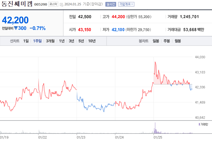 동진쎄미켐은 100% 수입에 의존하던 반도체 공정 재료의 국산화를 선도한 기업으로, 세계적인 기업들과 경쟁하고 있습니다. 특히, 일본이 반도체 수출규제를 했을 때 포토레지스트를 개발한 것으로 유명합니다. 동진쎄미캠의 미래에 대한 기대가 높으며 주가도 지속적으로 상승하는 모습을 보여주고 있는 종목입니다.