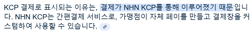 KCP 결제로 표시되어 문자가 오는 것은, 결제대행사인 NHN KCP를 통해 이루어졌기 때문입니다. 카드 가맹점이 자체 상호로 수정하지 않아서 간편결제 서비스인 KCP 결제로 표시된 것이라고 보면 됩니다.