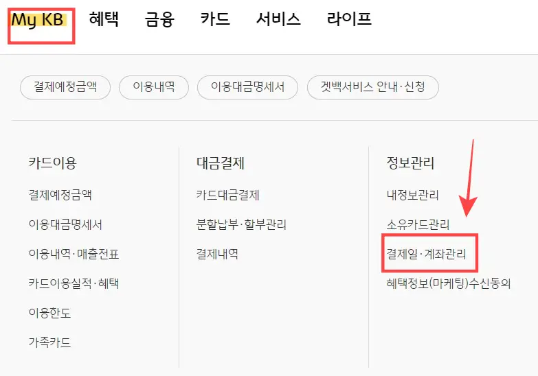 - 국민카드 홈페이지 - My KB - 정보관리 - 결제일 계좌 관리 - 결제일 변경