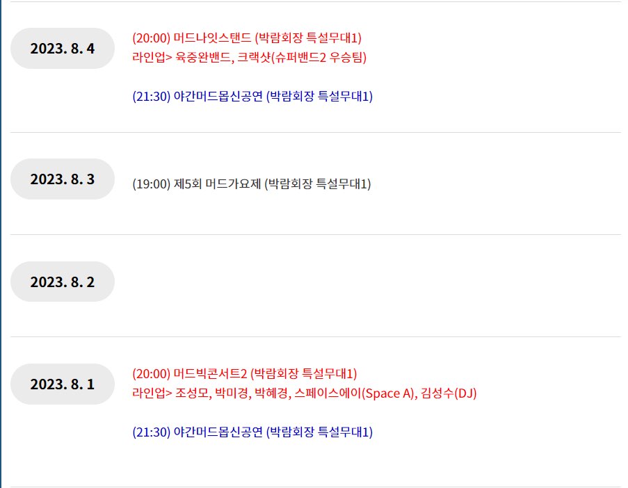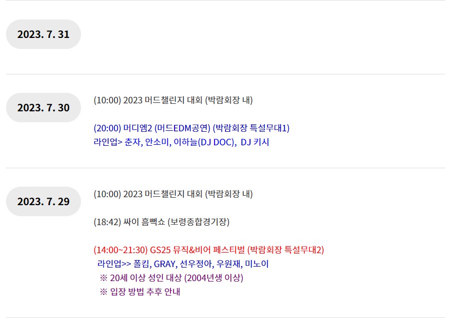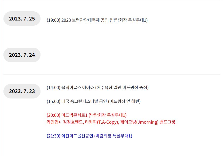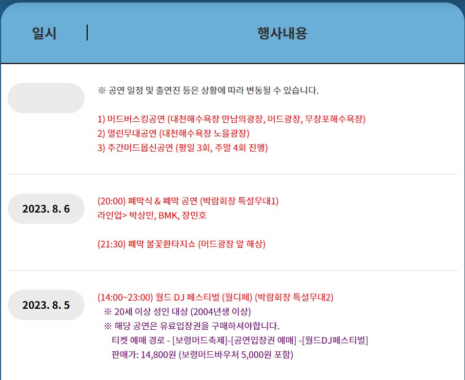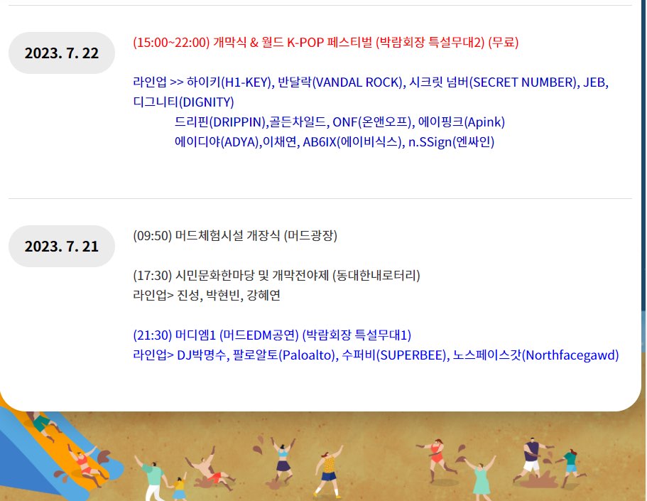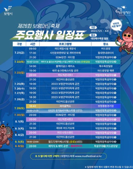 보령 머드축제의 다양한 행사를 한눈에 볼 수 있는 행사 일정표를 정리해보았습니다.