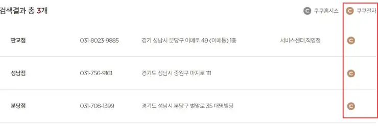 오른쪽의 갈색 원의 C로 표시된 것은 쿠쿠전자 서비스 센터를 뜻하며 압력밥솥의 AS를 해주는 곳이라고 보면됩니다. 검은색 원의 C로 표시된 것은 쿠쿠홈시스이고 정수기나 안마기 등의 렌털 서비스를 해주는 곳을 말합니다.