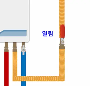 - 보일러 기기와 연결된 가스 공급 밸브가 열려 있는지 확인해 보세요. 보일러와 연결된 가스배관은 보통 노란색이나 주황색 계열입니다. 밸브가 배관과 나란한 방향으로 되어 있어요 열려있는 것입니다.